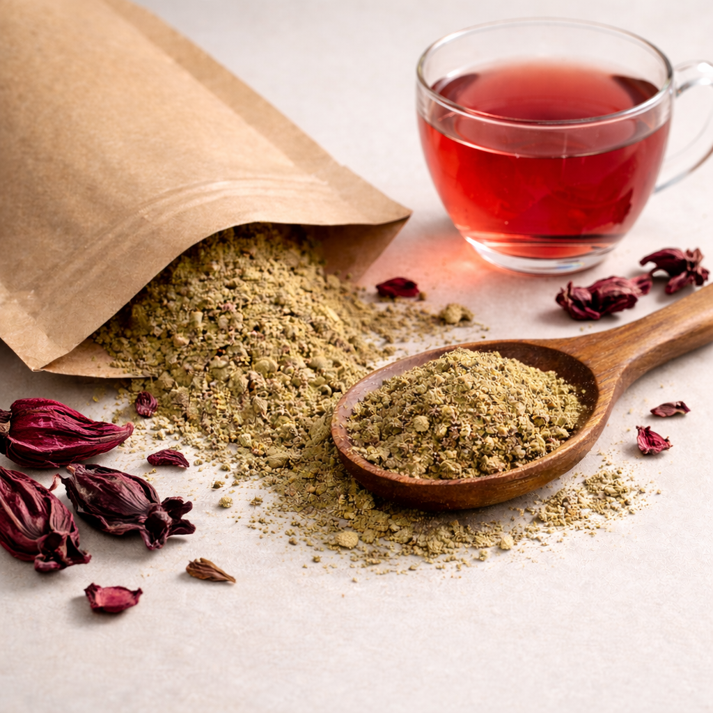 Hibiscus Tea Powder is made from dried hibiscus flowers, known for its refreshing taste and natural health benefits.
