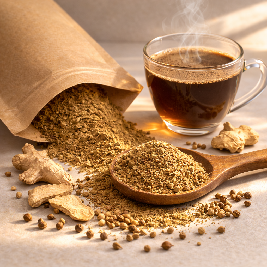 Sukku Milagu Coffee Powder is a traditional herbal coffee blend made with dry ginger (Sukku) and black pepper (Milagu) for warmth and wellness.